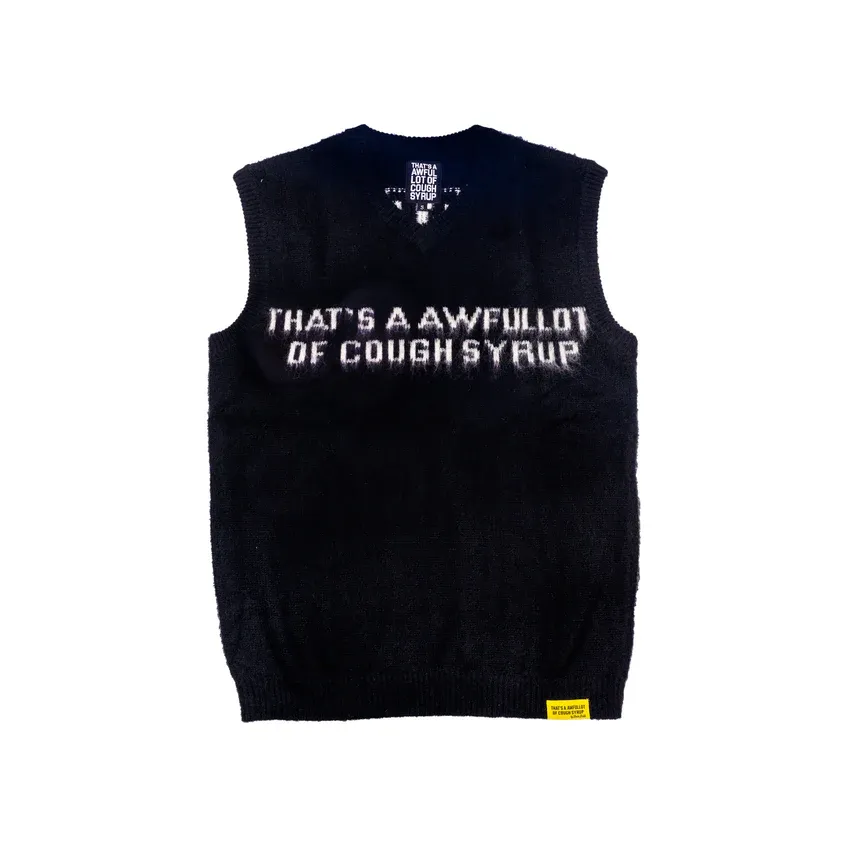 Mohair sweater vest with Cough Syrup logos intarsia-knitted across front chest and back.